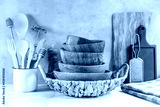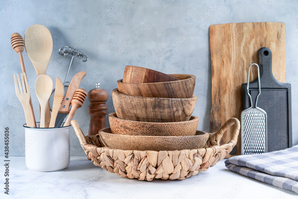 Stylish kitchen background with kitchen utensils on marble countertop, empty space for text, front view. Minimal cooking space with tableware.