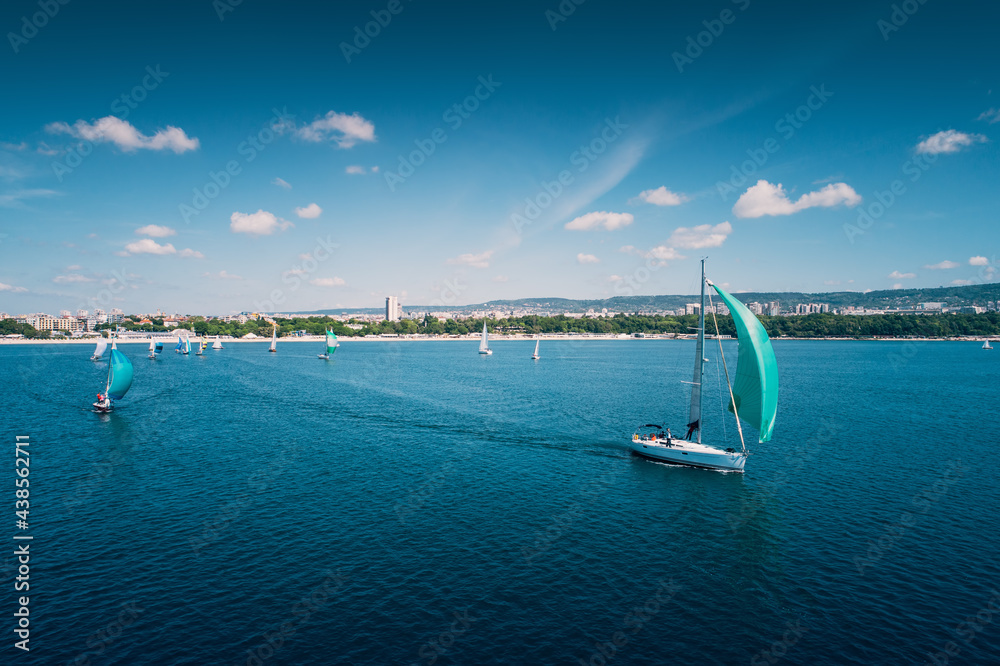 Regatta sailing ship yachts with white sails at opened sea. Aerial view of sailboat in windy condition