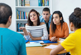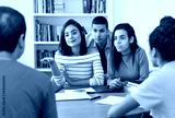 Gruppe internationaler Studenten diskutiert über Projekt