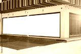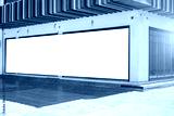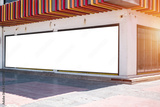 Long promotion blank banner on wall of city mall or store over empty sidewalk.