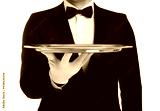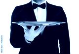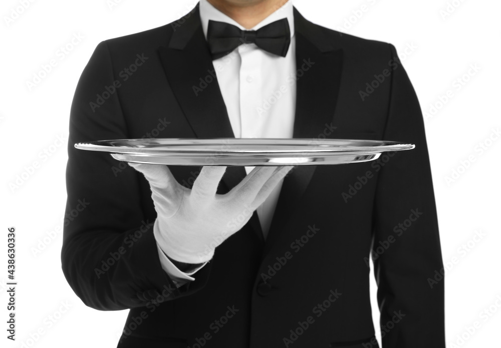 Elegant butler holding silver tray isolated on white, closeup