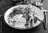 Grilled halloumi cheese salad with tomatoes and asparagus in strips of bacon on plate on dark background. Healthy food.