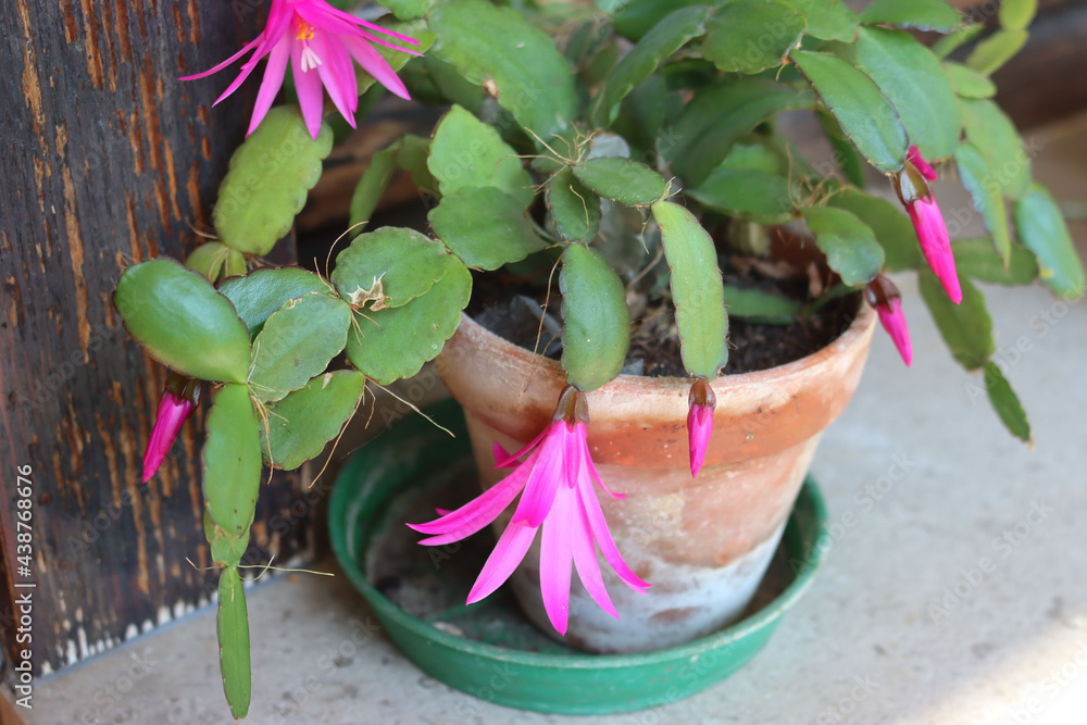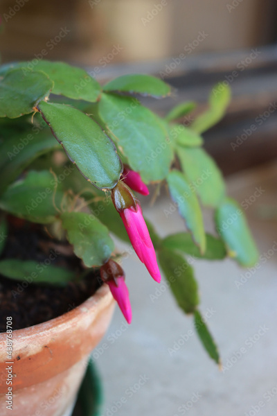 Christmas cactus with beautiful pink flowers. Close-up of Schlumbergera plant in bloom