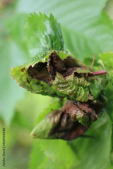 Disease on green Cherry tree leaves on branch in the orchard. Prunus avium with illness