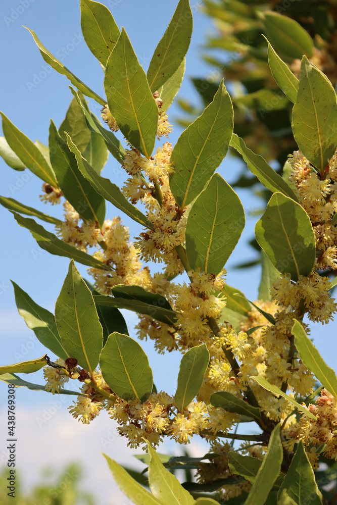 Close-up of many yellow flowers of Laurel bush on branch. Laurus nobilis in bloom on springtime