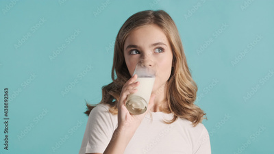 Portrait of beautiful teenager girl drinking fresh milk looking