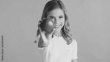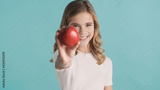 Portrait of pretty teenager girl offering red apple and smiling