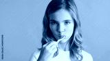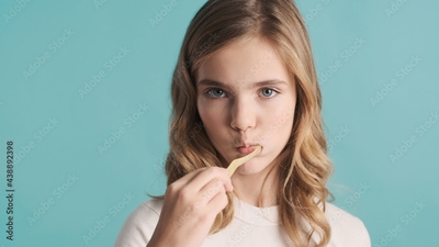 Portrait of teenage girl cleaning her teeth on camera isolated o