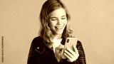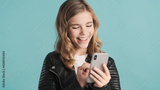 Cheerful teenager girl sitting in social networks looking happy
