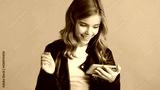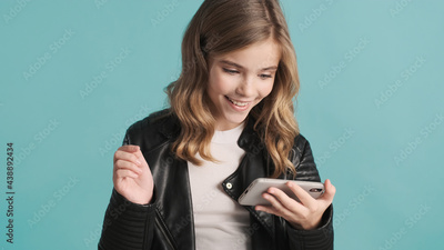 Pretty cheerful teenager girl watching funny videos on phone iso
