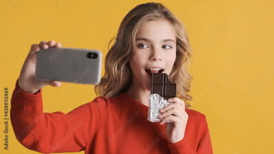 Pretty teenage girl taking selfie with chocolate for social netw
