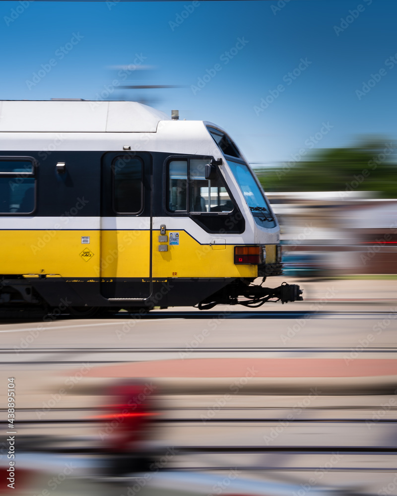 Subway Train in Action Moving Thru Suburban Area, Moving Railway Train with Motion Blur, Modern Public Transport at High Speed