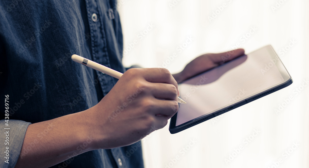 man using white tablet stylus write on tablet blank screen in living room for working from home or using internet for online shopping and social network,online learning.