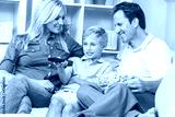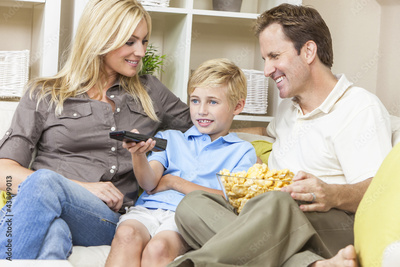 Happy Family Sitting on Sofa Watching Television