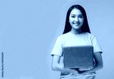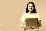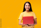 Happy young asian woman holding red gift box and get happiness Standing over yellow background Beautiful Asia girl happy smile hold new year gift box present or Christmas gift Using for advertisement