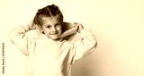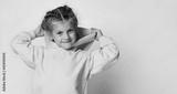 Portrait of a joyful active little girl wearing a hood on a white background. Happy cute child in a yellow sports hoodie white background. Sportswear advertising concept. Banner.