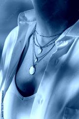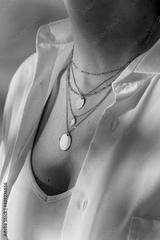 beauty, fashion and jewelry trends concept - close up of woman in white shirt wearing golden multi layer necklace with coin medallions