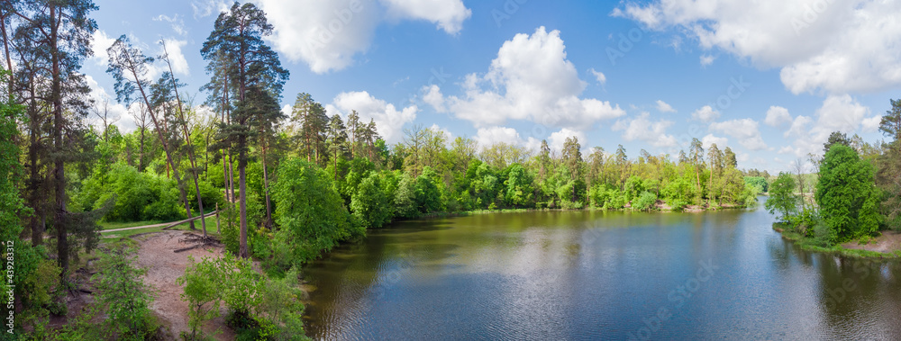 Lake with coniferous and deciduous forest on shores, panoramic view