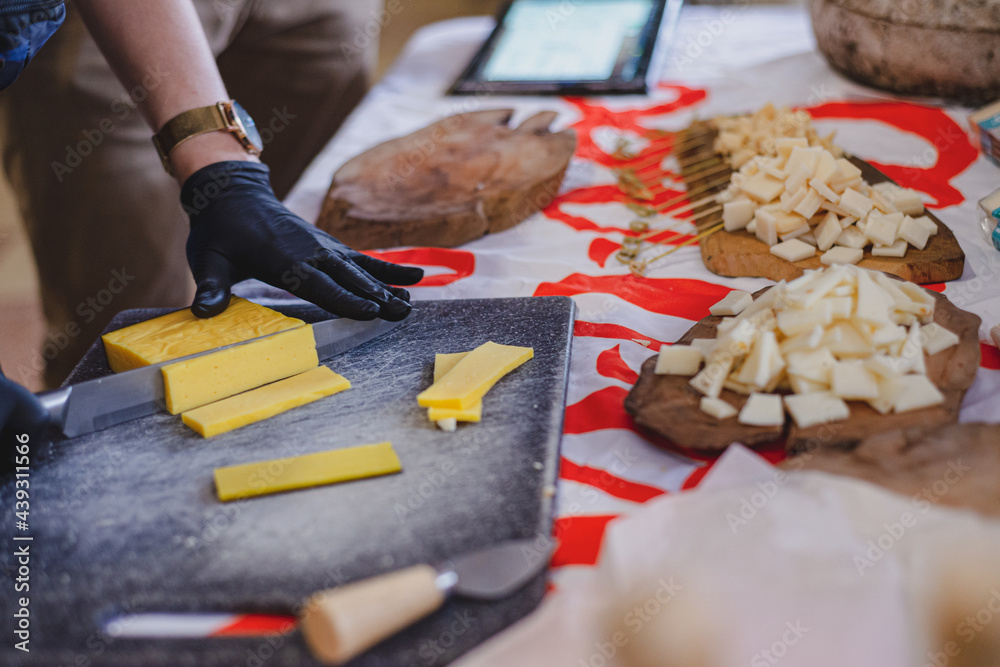 The seller makes cheese slices on the counter