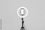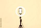 Modern tripod with ring light and smartphone on yellow background