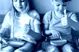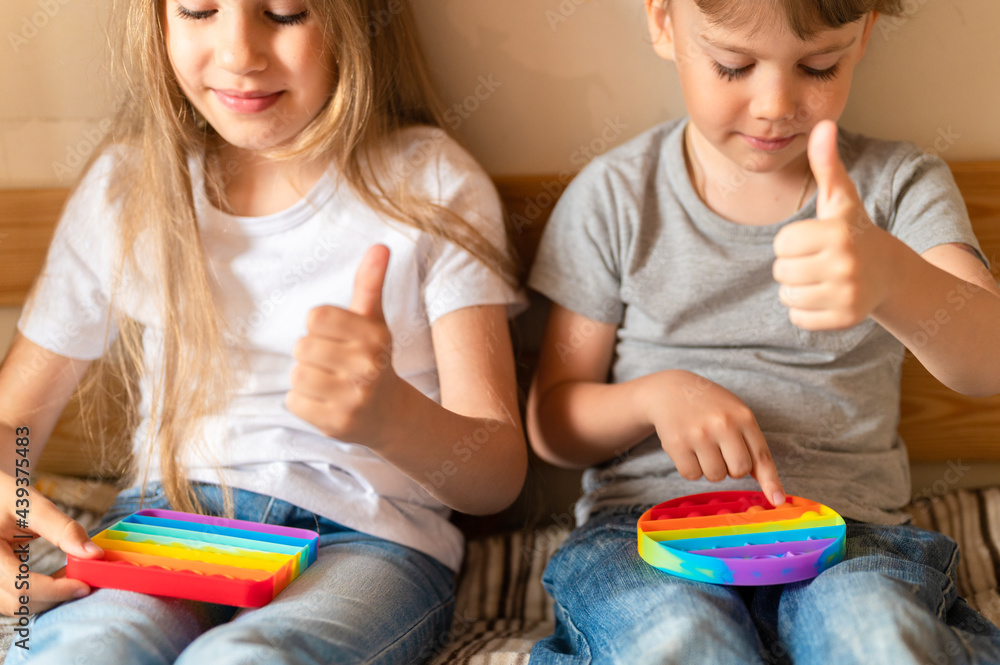 little happy kids plays with children's anti stress sensory pop it or simple dimple toys and showing hand like or thumb up. toddlers holding and playing popit rainbow bright color, trend 2021 year