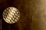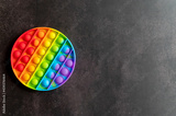 kids anti stress sensory pop it or simple dimple fidget push toy on a black table or floor background. round popit rainbow hue bright color, trend 2021 year. top view, flat lay. space for text