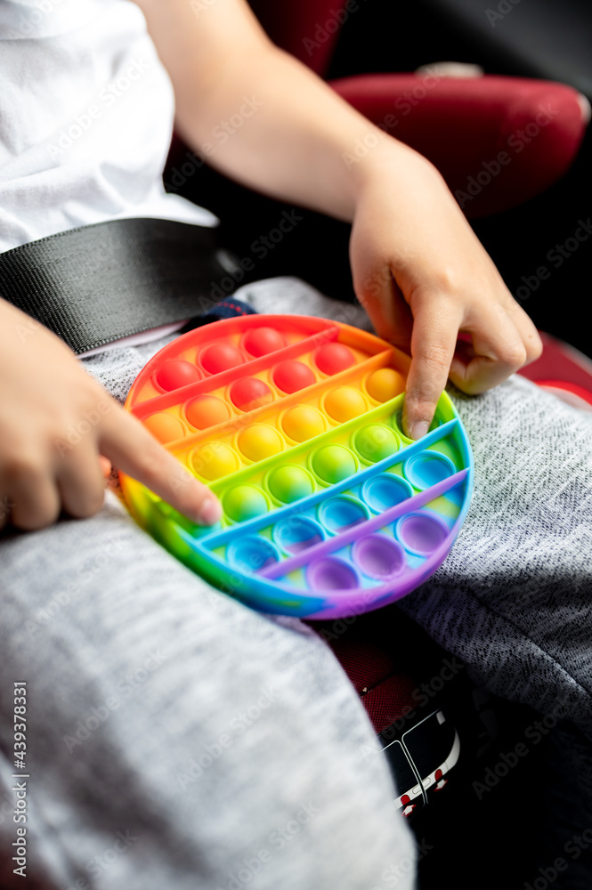 anti stress sensory pop it toys in a children's hands. a little happy kid boy plays with a simple dimple toy in the car. toddler holding and playing popit rainbow hue bright color, trend 2021 year