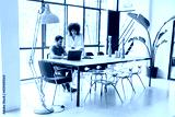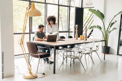 Young multiracial couple working at home with laptop. Spacious bright loft apartment.