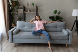 Full length smiling Arabian woman relaxing on couch at home, leaning back, enjoying lazy leisure time alone, satisfied peaceful attractive young female sitting on cozy sofa, breathing fresh air