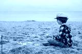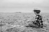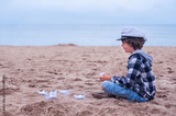 Romantic boy sitting with closed eyes in profile on the sand by the sea and making origami boats. Summer Travel Dream Concept. Traveler child. Dreamy boy on the seashore with a paper boat in his hands