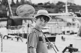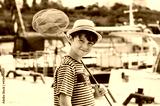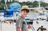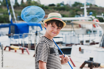 Happy boy in a hat with Italian flag, a striped T-shirt stands on the yacht pier with a fishing net. Summer travel. Sea pier. Boy fisher on berth. Summer vacation. Child is resting. Water transport