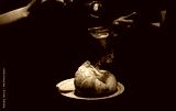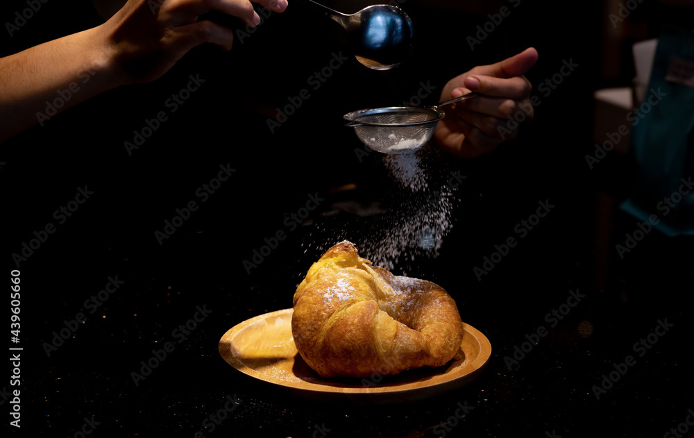 Cafe staff uses colander to sprinkle icing sugar for croissants serving customers in the cafe with best teasted.