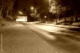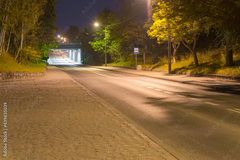 Asfaltowa droga przebiegająca pod wiaduktem kolejowym. Widok w nocy.