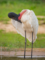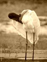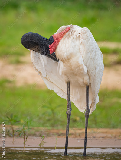 Large adult woodstork preens right wing feathers in Pantanal
