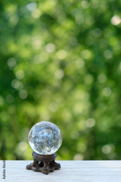 magic clear quartz ball on green natural background. beautiful crystal ball for meditation, relaxation, Witchcraft. healing mineral. spiritual practice