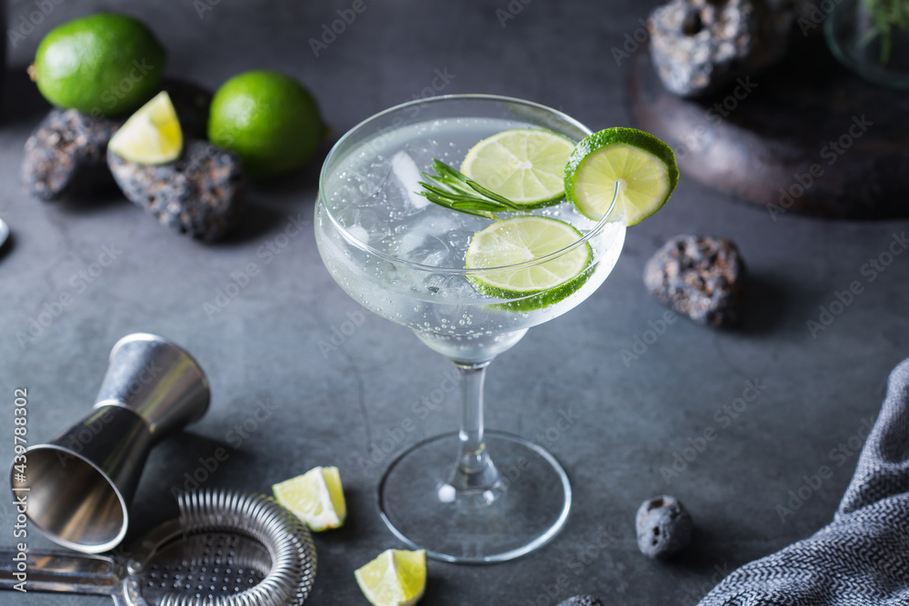 Hard seltzer cocktail with lime, rosemary and bartenders accessories