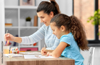 family, hobby and leisure concept - happy smiling mother spending time with her little daughter drawing or painting wooden chipboard cutouts with colors at home
