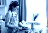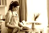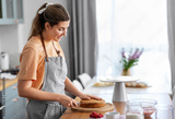 culinary, baking and cooking food concept - happy smiling young woman making layer cake on kitchen at home