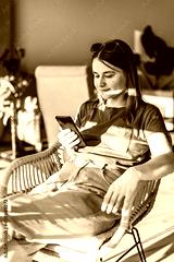 Young pretty woman in green beige clothes sitting in wicker chair and texting in sunlight and shadows, earth colors, using smartphone