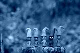 Figures of multi-colored gnomes on a colored background.