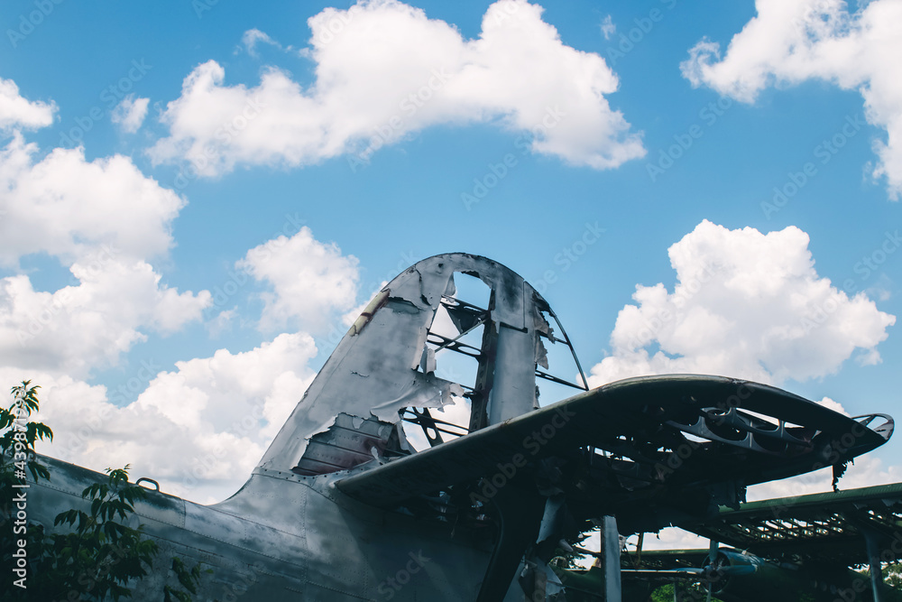 The tail of an aircraft that has collapsed from time to time or from an accident. Metal parts of the frame, parts of the fuselage, skin and pieces of fabric are visible. Rust and scraps of old fabric