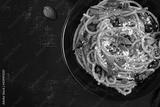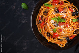 Spaghetti alla puttanesca - italian pasta dish with tomatoes, black olives, capers, anchovies and basil. Top view, flat lay