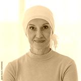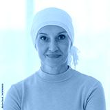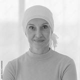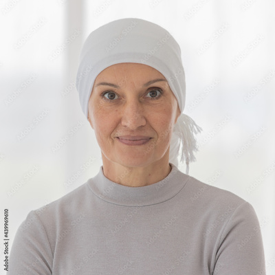 Middle-aged woman cancer patient lost hair from chemo cure process and use clothe cover her head posing to camera with strength eyes and emotion