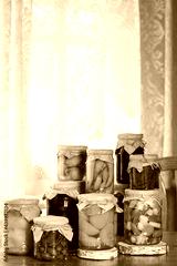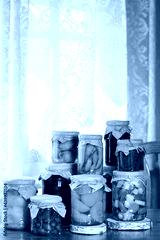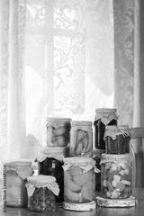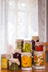 Homemade preserved, fermented food, pickled, marinated vegetables, fruit compote