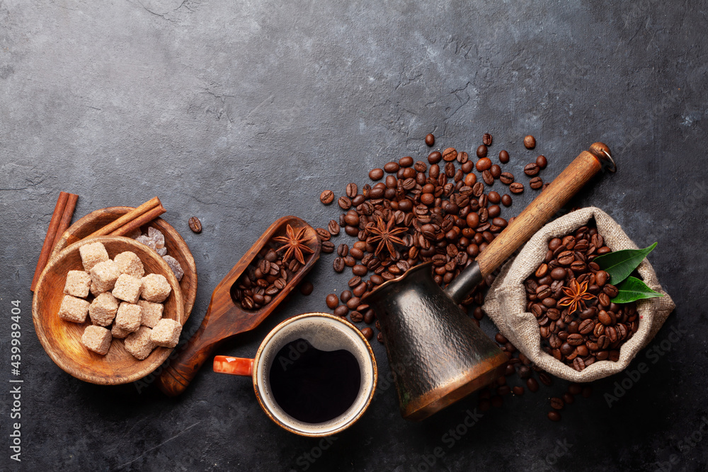 Roasted coffee beans, Turkish jezve, coffee cup and sugar