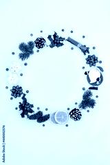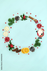Christmas decorative wreath with winter greenery, loose holly berries, food and tree bauble decorations on pastel blue background. Holiday composition for the Xmas and New Year.