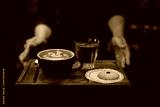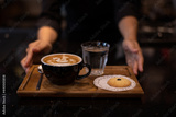 Cup of coffee ,cooking and glass of water cafe staff serve on wood tray for customer in cafe shop.
