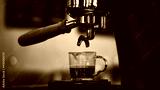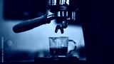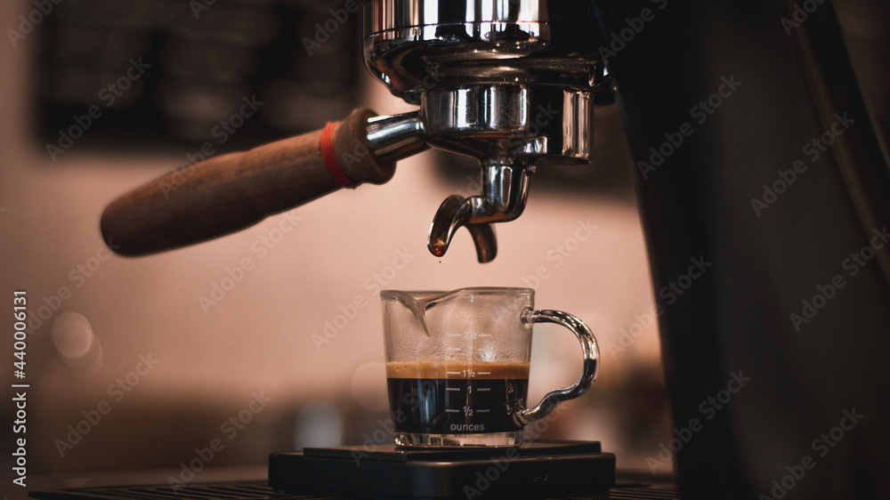 People pouring coffee into jar after drip coffee process at the cafe. There are water glasses and ice glasses to taste.
