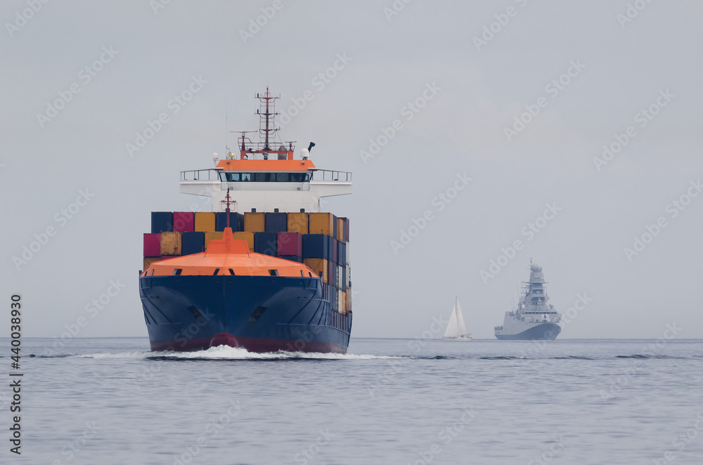 CONTAINER SHIP AND WARSHIP - Freighter and frigate sails on the sea