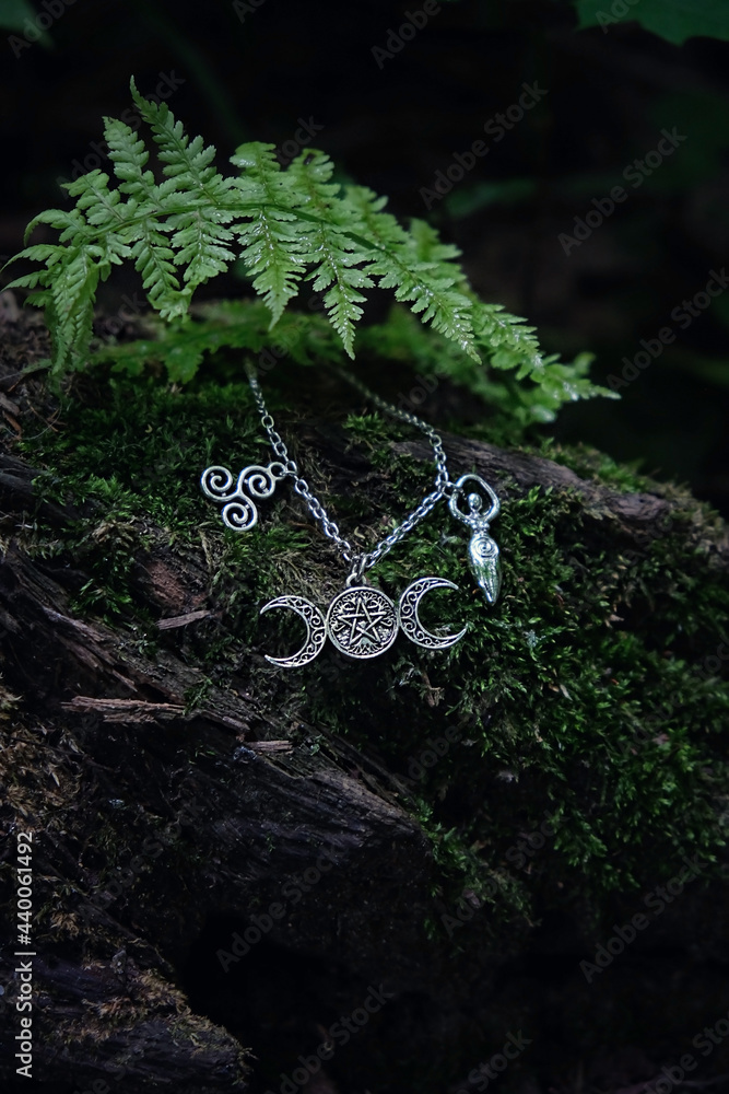 wiccan amulet with pentagram Triple Goddess, Lunar phase symbol on natural dark forest background. Esoteric spiritual Ritual. Mysticism, divination, modern wicca concept